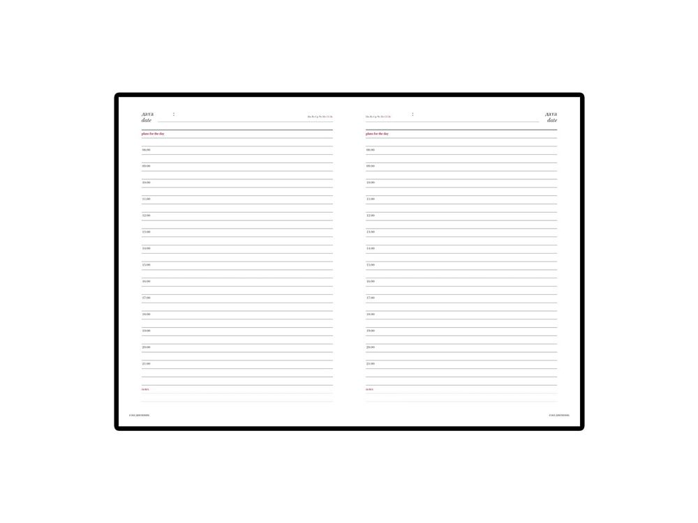 Две строчки на каждой странице отведены на ежедневное планирование. Есть почасовая разбивка страниц. Две последние строчки служат для комментариев. Строгий классический материал, прекрасная практичная альтернатива дорогостоящей натуральной коже. Идеально сочетается с тиснением фольгой.