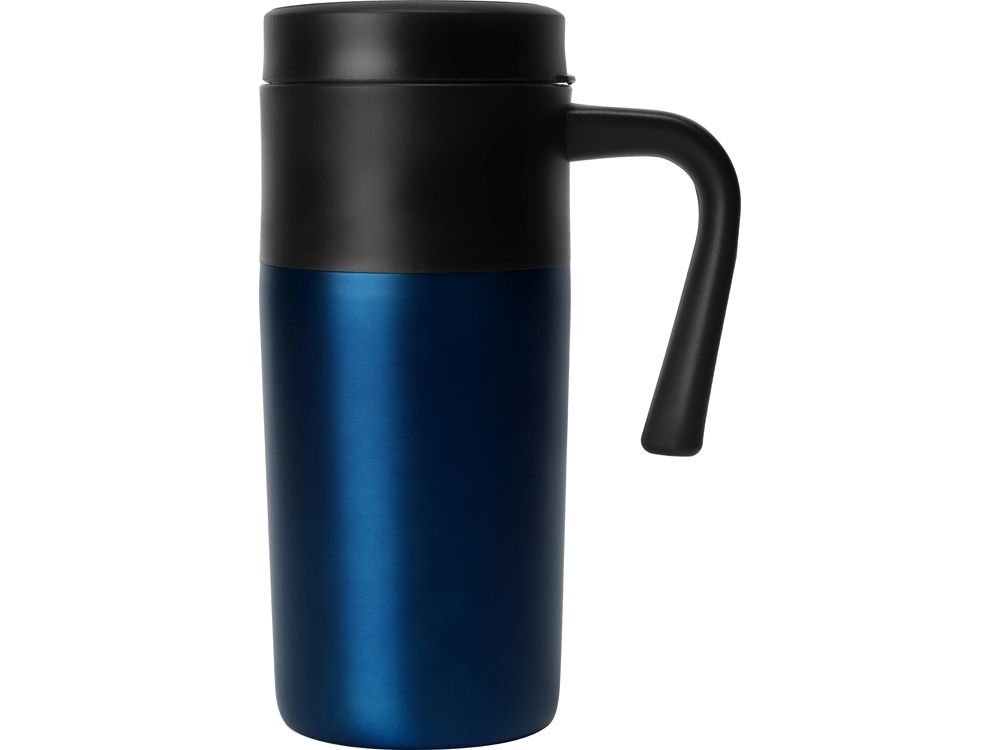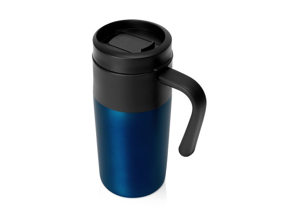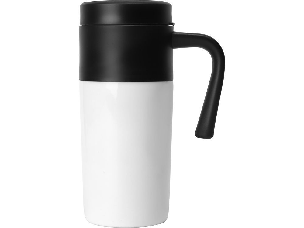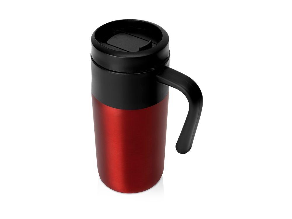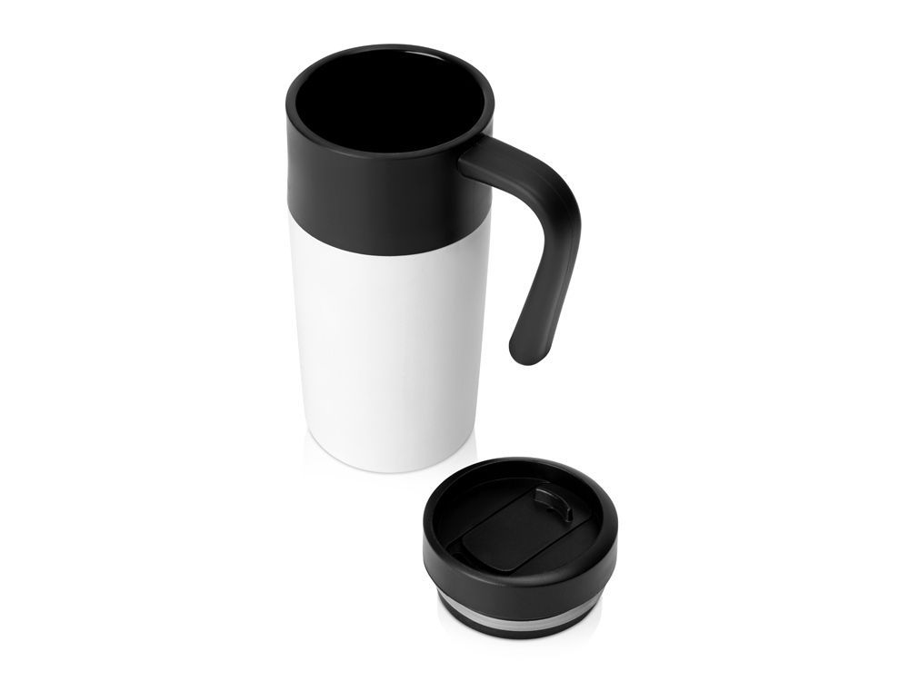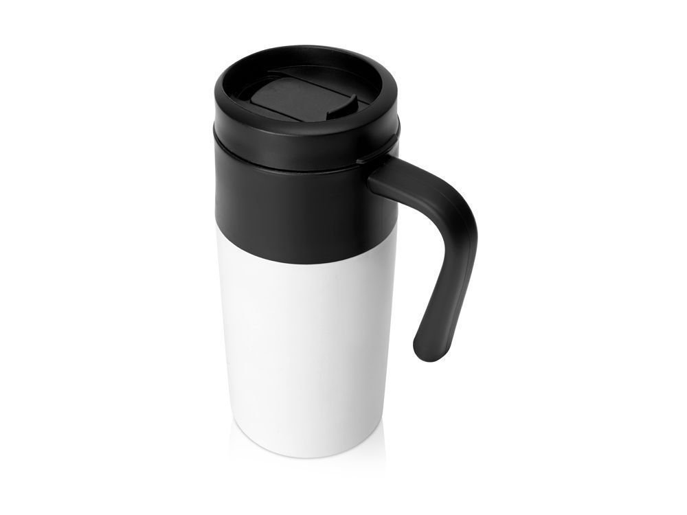 Термокружка с фиксированной ручкой и крышкой-слайдером. Внутренняя колба выполнена из безопасного полипропилена. Внешний корпус сделан из нержавеющей стали. Объем 330 мл.